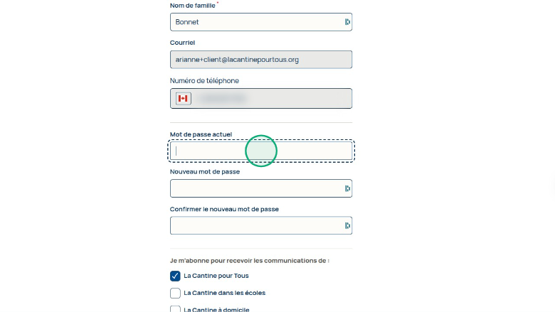 Si vous souhaitez modifier votre mot de passe, saisissez votre mot de passe actuel dans le champ « Mot de passe actuel ». Créez ensuite votre nouveau mot de passe dans le champ suivant et saisissez-le une seconde fois.