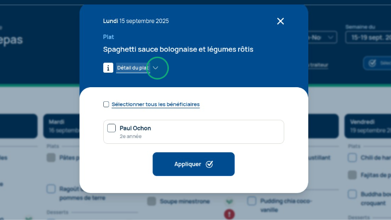 Cliquez sur le plat pour sélectionner un élève et afficher les détails du repas.