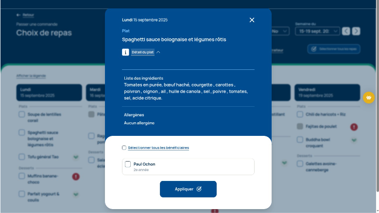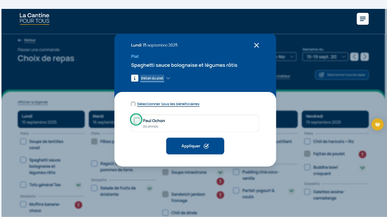 Sélectionnez l’enfant pour lequel vous commandez le repas.