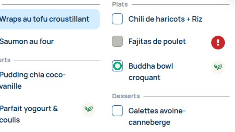 Cliquez sur les éléments du repas pour les jours où vous souhaitez commander.