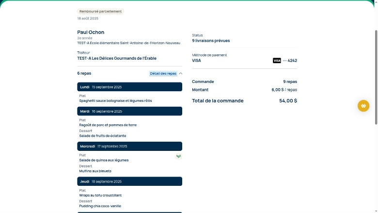 Vos repas commandés sont affichés. C'est d'ici que vous pouvez annuler des repas, tant que vous êtes encore dans le délai d'annulation.