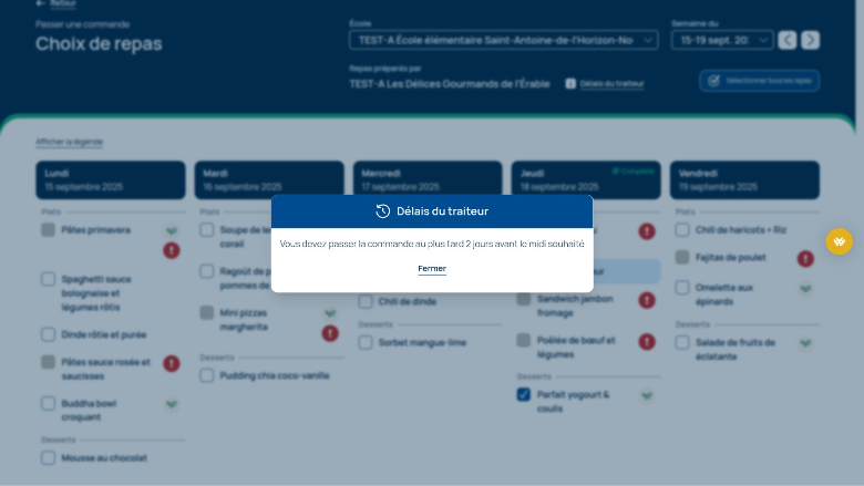 Choisissez l'école du bénéficiaire et la semaine pour lequel vous voulez commander