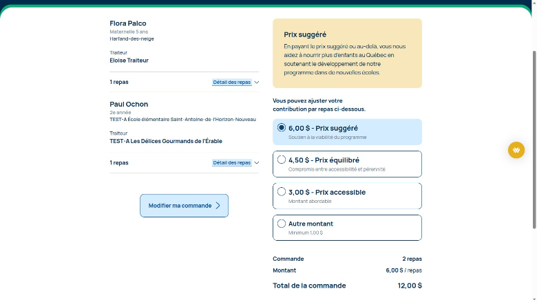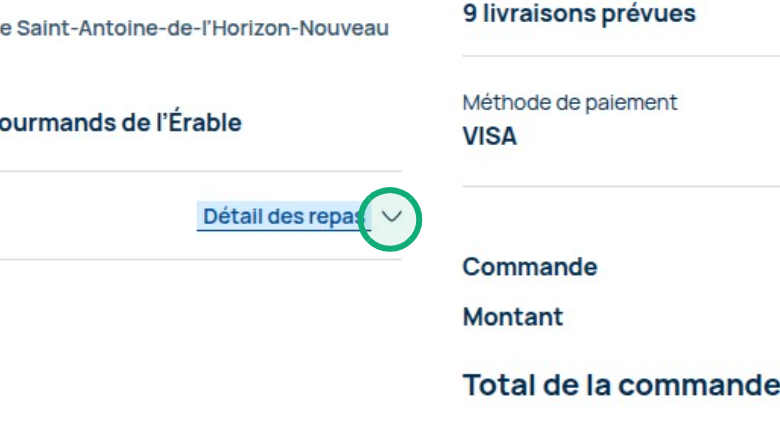 Consultez votre commande. Cliquez sur « Détail des repas » pour voir tous les repas de votre commande. Sélectionnez vos options de contribution aux repas en fonction de vos moyens. Puis cliquer sur « Passer au paiement ».