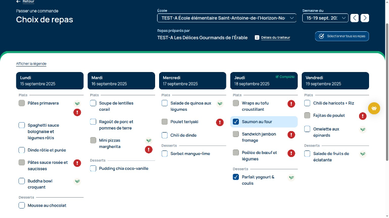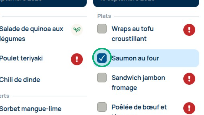 Vous pouvez sélectionner les repas pour les jours de votre choix. Une icône rouge apparaît lorsqu'un repas contient des allergènes que votre bénéficiaire ne peut pas consommer, comme indiqué dans son profil.
