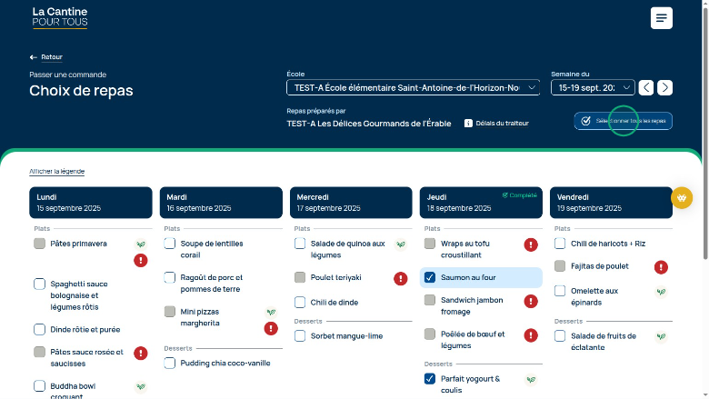Cliquez sur « Sélectionner tous les repas » pour sélectionner tous les repas de la période entière en un clic.